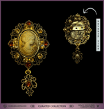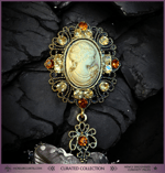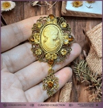 This exquisite antique-style cameo brooch features a finely detailed profile of a lady, framed by ornate metalwork and sparkling amber-toned rhinestones.